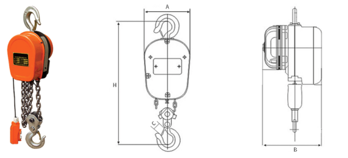 | 型號 | 額定載荷 | 實驗載荷 | 電機功率 | 電源 | 提升速度 | 起重鏈條數 | 標準起升高度 | 圓鋼直徑 | 主要尺寸 | 凈重 | 裝箱尺寸 | 起重高度每1M加重量 | ||||