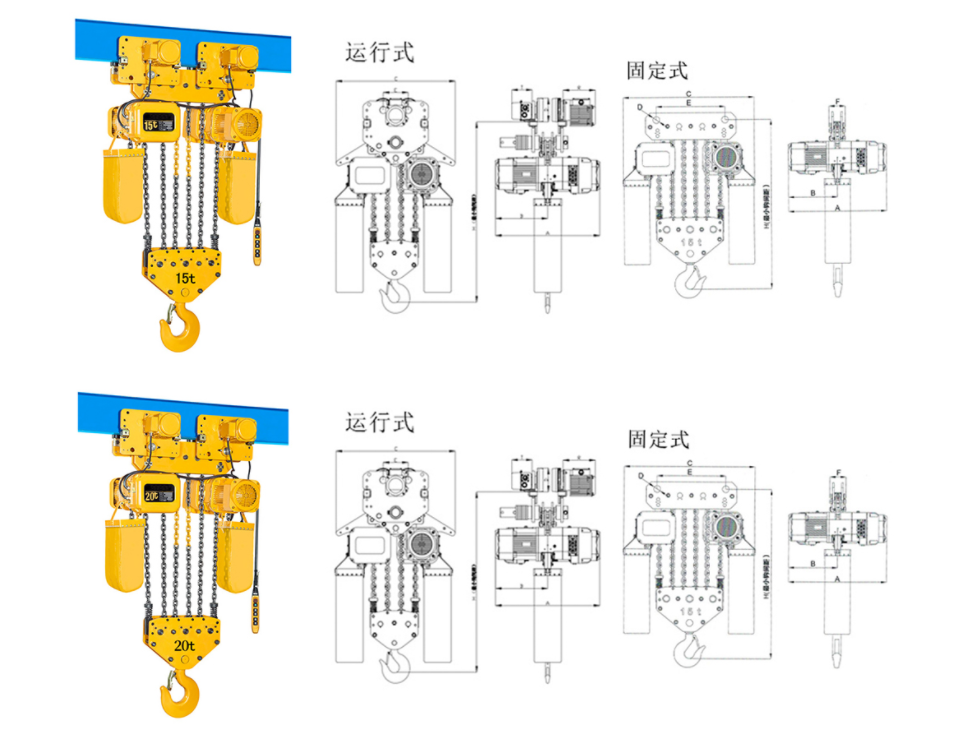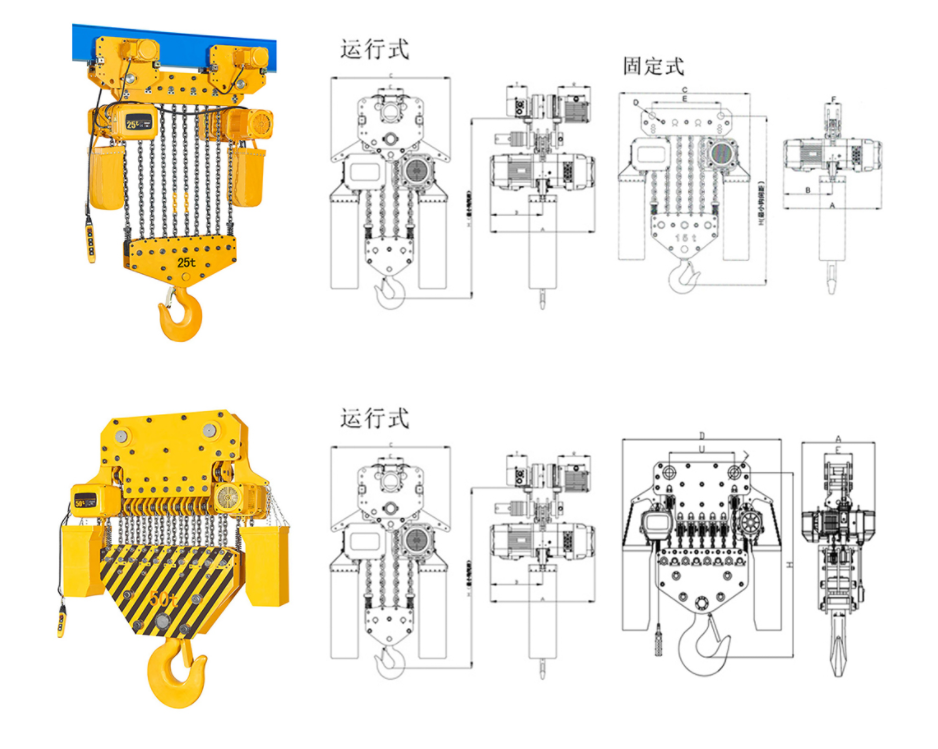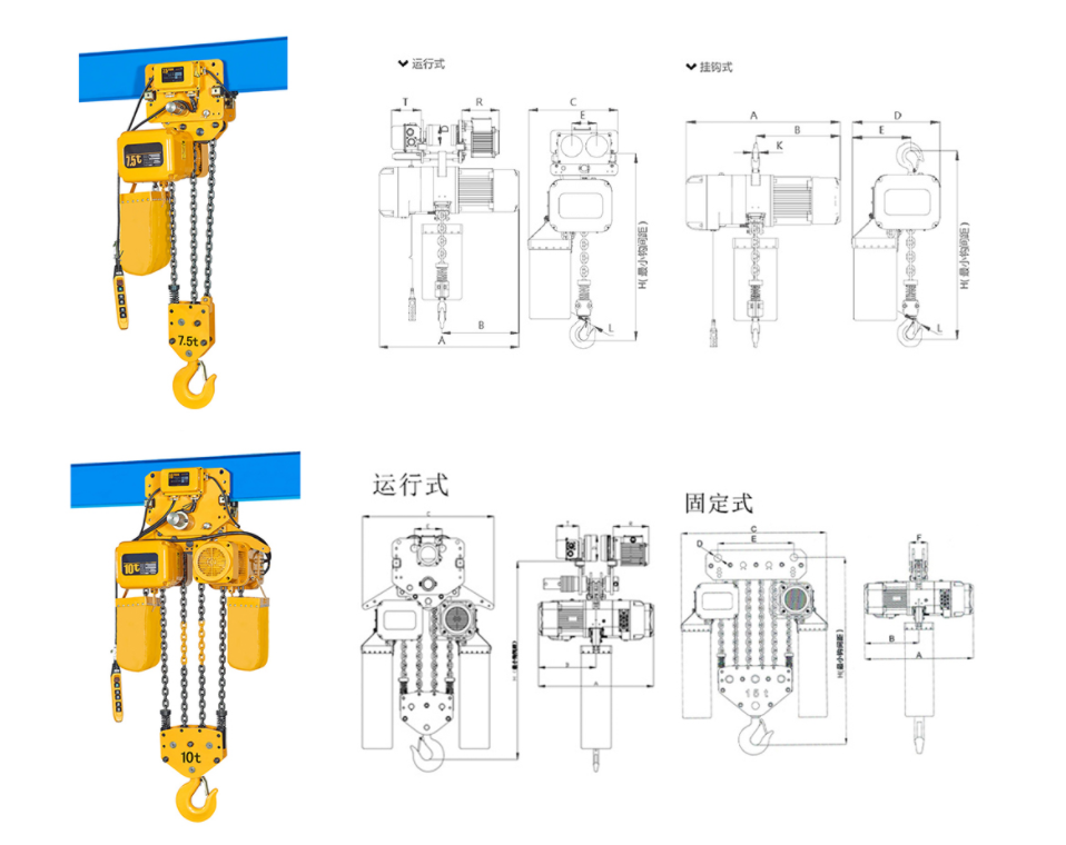 | 運行式環鏈電動葫蘆(7.5T-50T)尺寸參數: | ||||||||